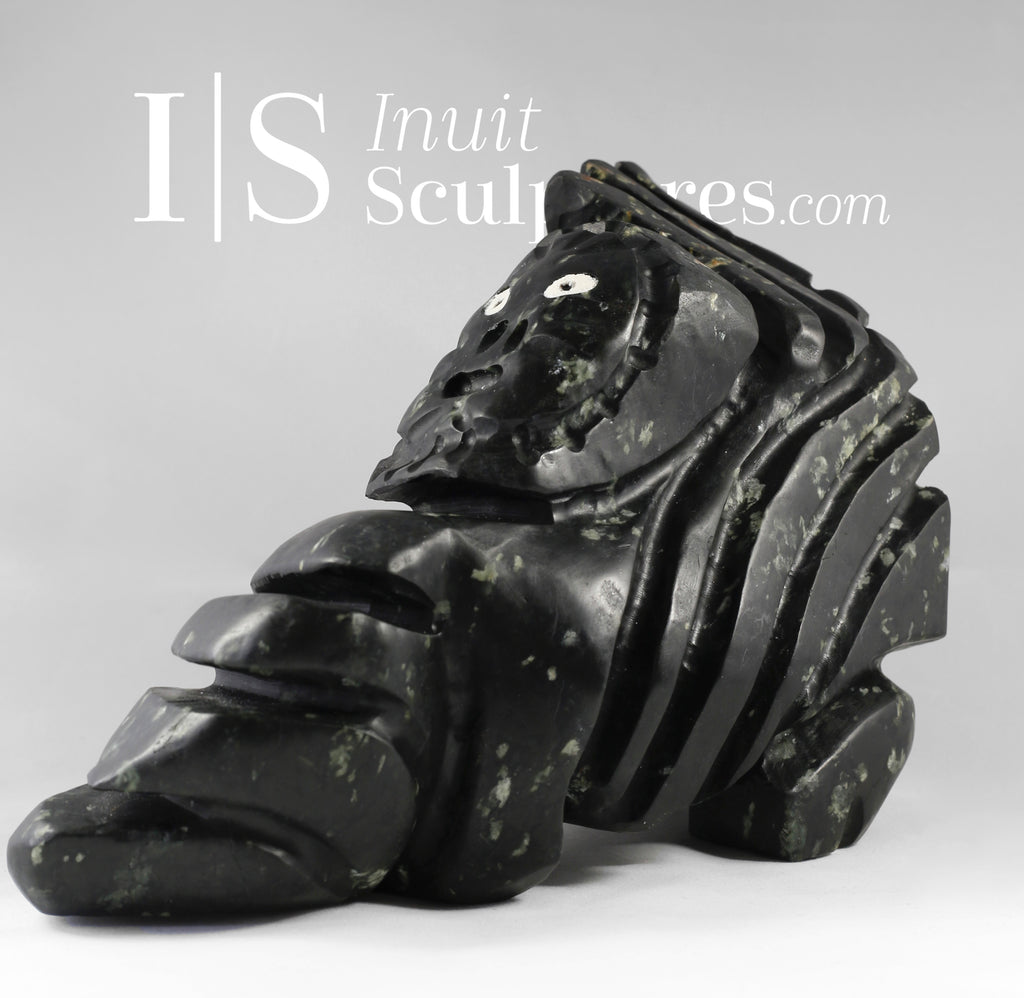 Keknek often carves deep repeating lines into his carvings which creates ridges that give the piece a three dimensional look. To see this effect, look at the back of this piece.