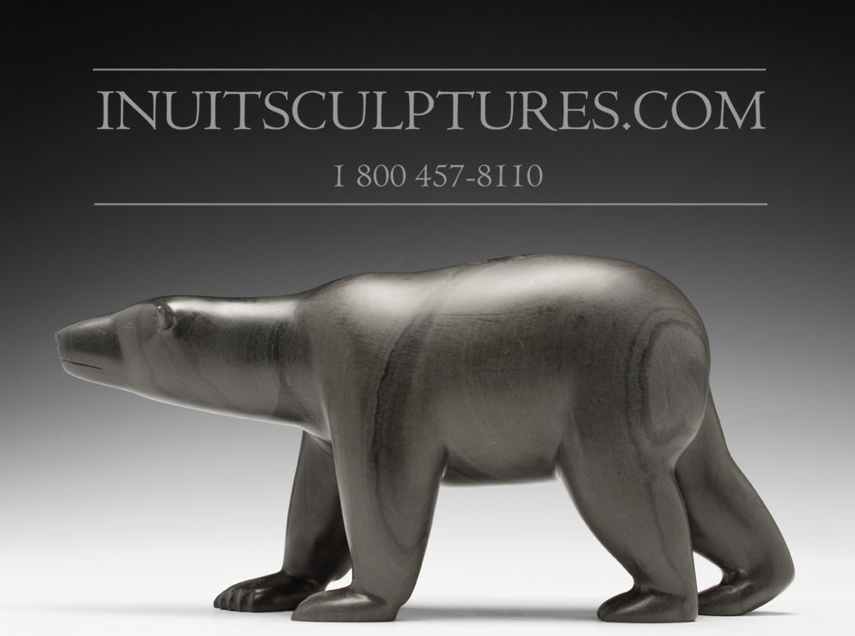 This is one of the nicest walking bears to come out of Sanikiluaq in a long time. The finesse of the stone with the beautiful grained stripes is absolutely breathtaking. The carving almost wants to float away it is so refined. This is one of those pieces of art that defines perfection.