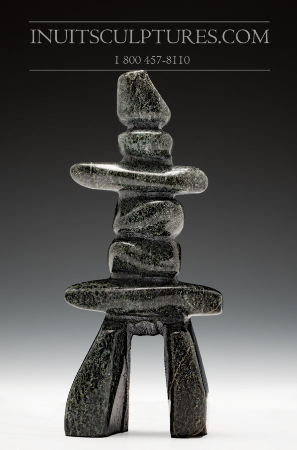 This is a gorgeously balanced inukshuk done in a striking serpentine stone from Cape Dorset. The curves are exceptional and the refined stone adds a beautiful mix between modernism and traditional style. This piece is polished to a mirror shine.