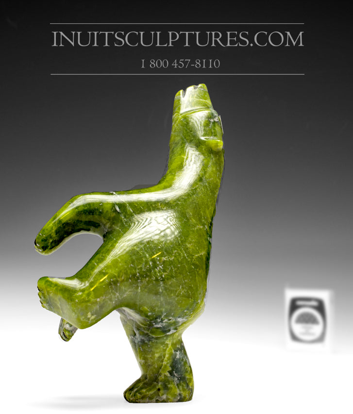 This bear was obviously carved by an artist who carefully observed the animal subjects and Loved them. Despite being carved from a large sized, heavy stone, the work has a lightness of spirit. The apple green stone is divine and electric.
