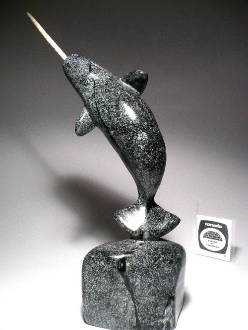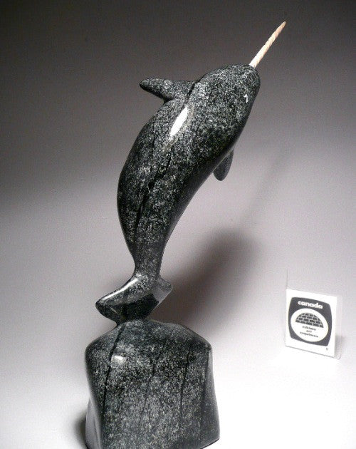 This is a gorgeous dancing Narwhal made by Onah Onalik from Iqaluit, Nunavut. The stone used is carved in a very rare “soft grey” serpentine that endows this lively Narwhal with an exotic and sophisticated luminosity.