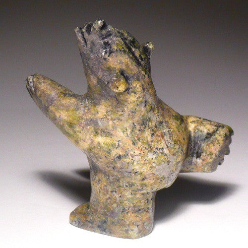 This is a beautiful brown dancing bear by the acclaimed Inuit artist Moe Petooloosie. This exquisite dancing bear was acquired directly from his hands in Iqaluit (arctic Canada).