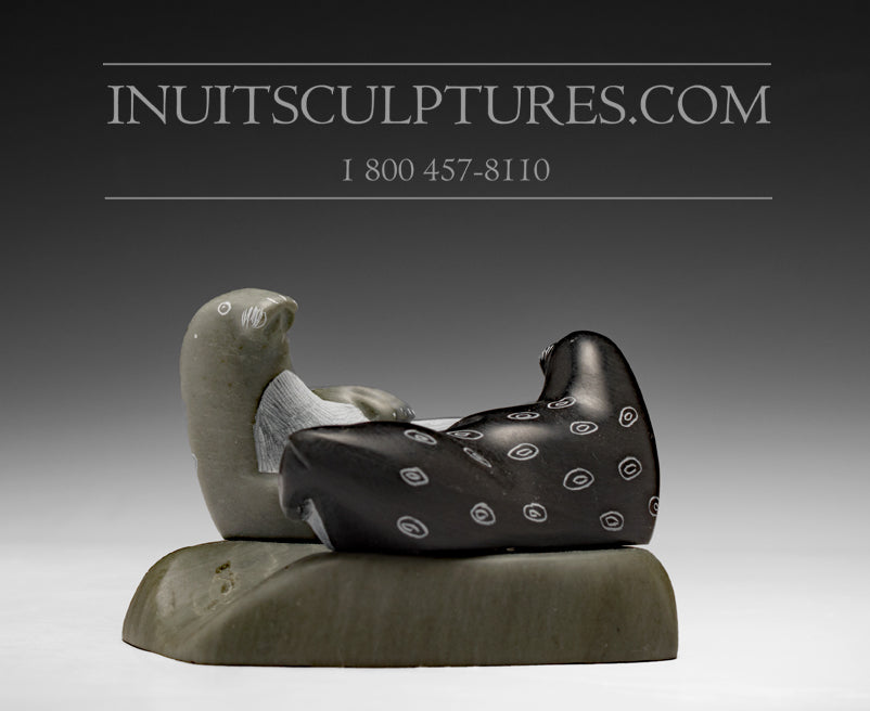 What caught my eye is the jet black coloration used for the stone. I also particularly like the heads of the two seals as well as the etching mark spots on the back. Josie Iqaluq is well known for his playful fun loving seals. They make wonderful gifts for weddings or anniversaries as they convey peace and harmony. It is very symmetrical and round with a gorgeous smooth finish to it. A property among Sanikiluaq art which makes it so famous.