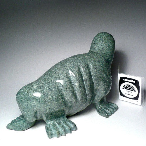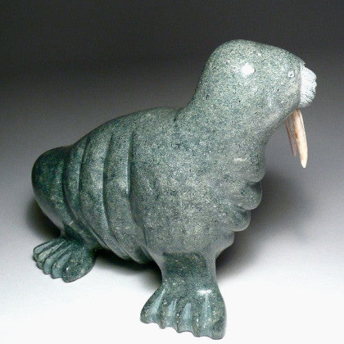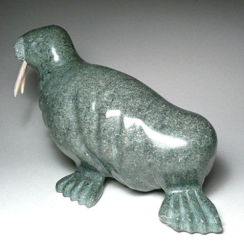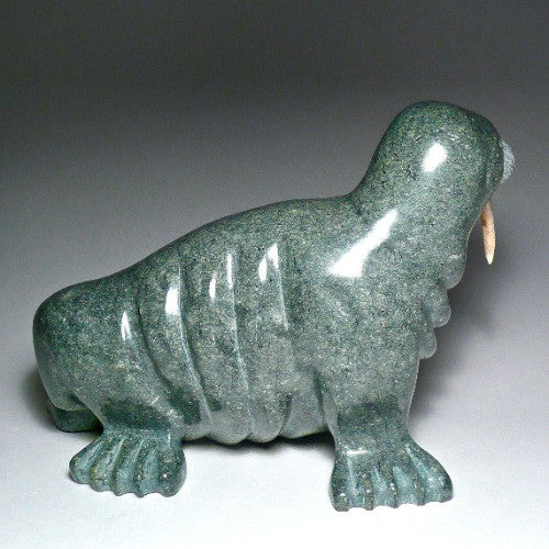 This is a gorgeous soft green basking walrus made by Noah Onalik from Iqaluit, Nunavut. The dimensions and proportions are very life like. There are beautiful curvatures contouring the sculpture. This walrus is full of life and grace. I particularly admire the tusks which add a wonderful contrast to the beautiful aqua green stone.