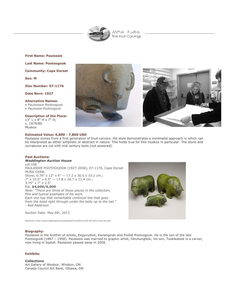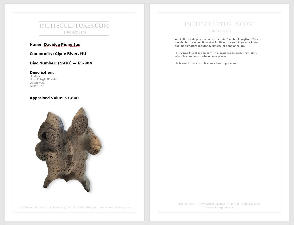 With a letter of appraisal, you can be sure to maximize the value of your piece as opposed to just hearsay. Our price is $340 CAD. In order to proceed, simply checkout on this page. Once this step is complete, send us as much info you have regarding your piece to info@inuitsculptures.com. This should include: