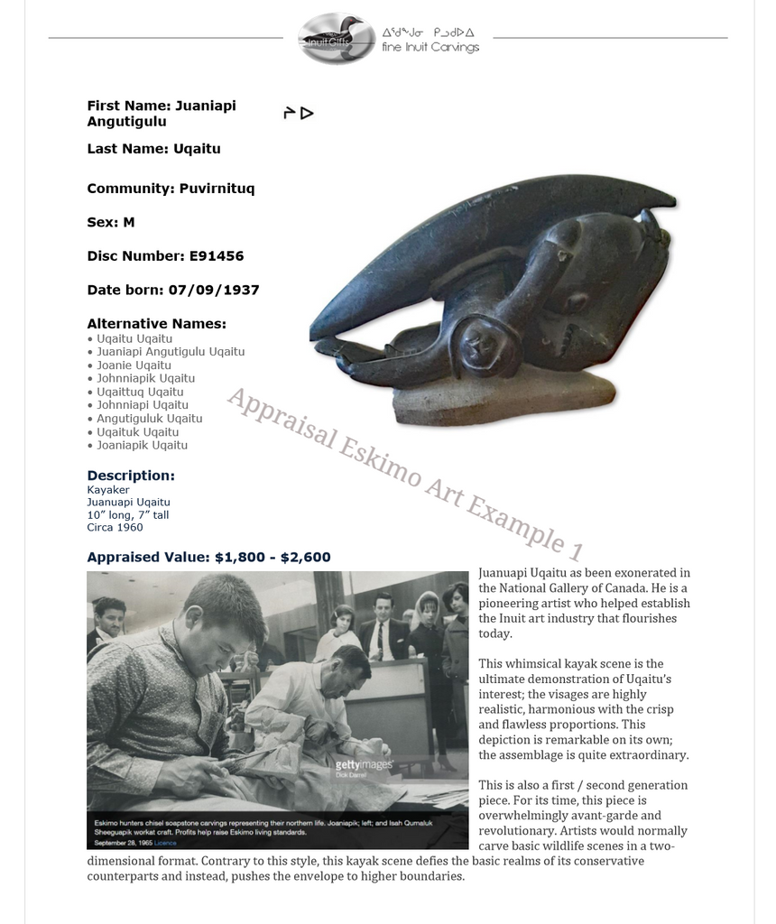 Appraisals provide financial and historical assessments of Quality Inuit Fine Art.