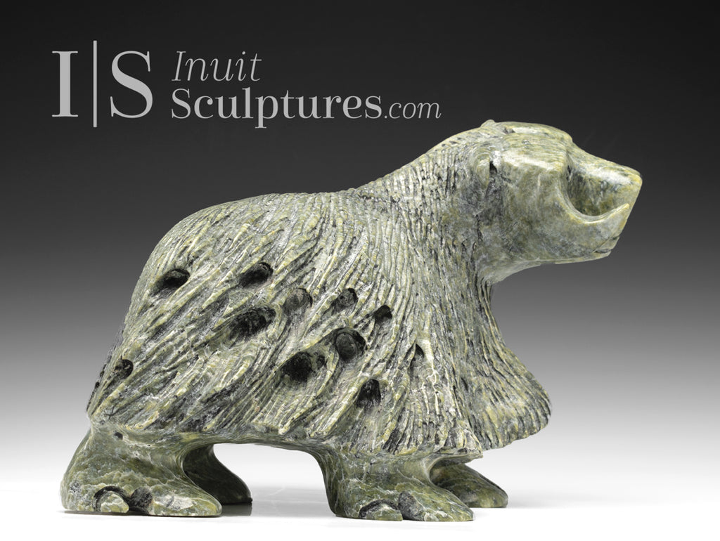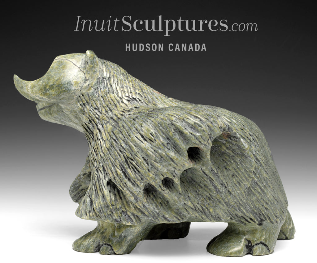 They are masculine and dignified. Our muskox has fierce looking sharp horns which could do serious damage to a predator. The soft green coloured stone always the viewer to easily see every detail of the piece. It also offeres a softness to the angular sculpture.