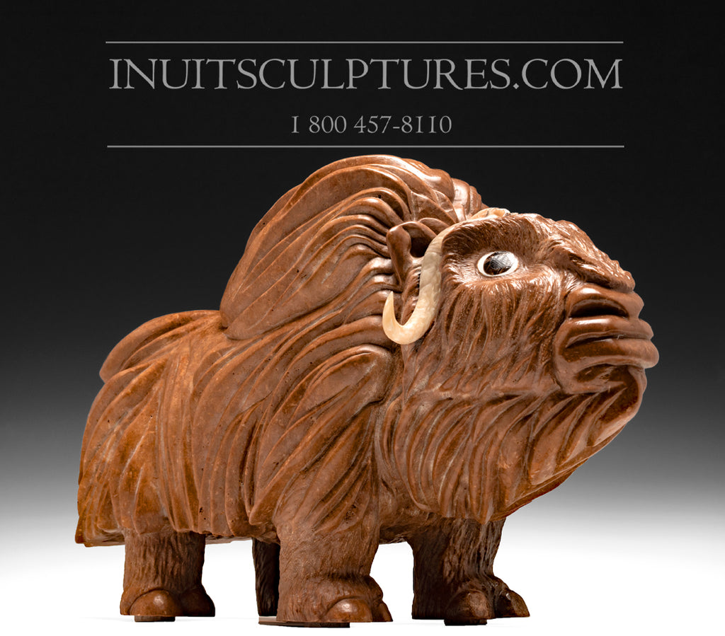 Provenance June 2019 - Damien only carves 2 -3 muskox like this a year. He uses a 40,000 year old mammoth tooth (a prehistoric animal) for the eyes. The muskox is draped in a beautiful copper brown dolomite stone. Damien is a master of mixed media.