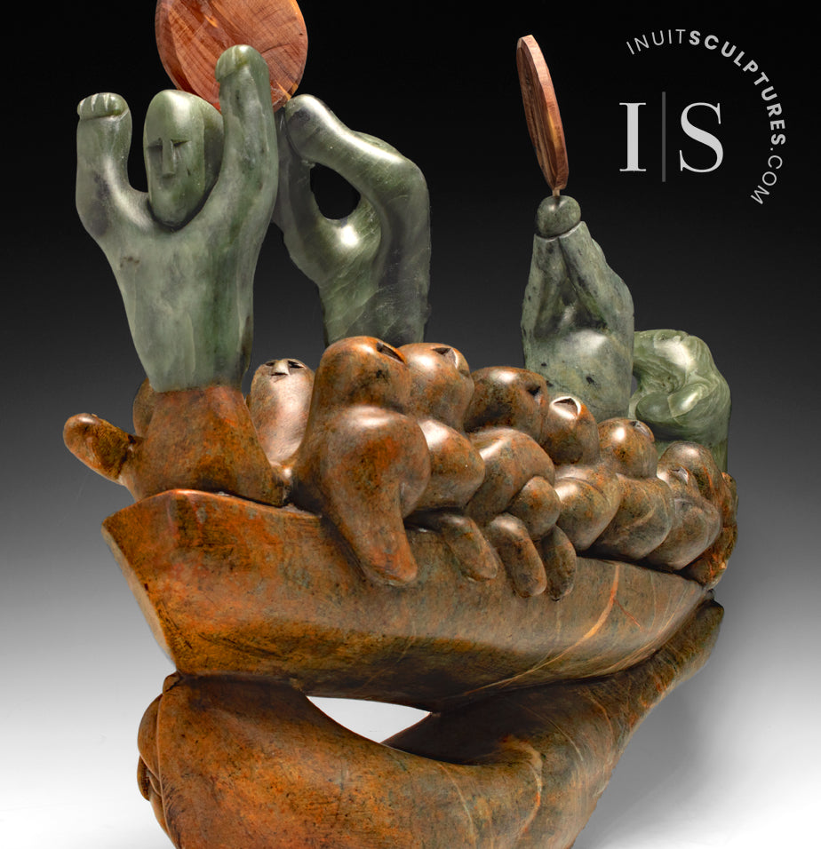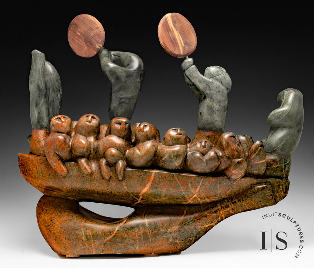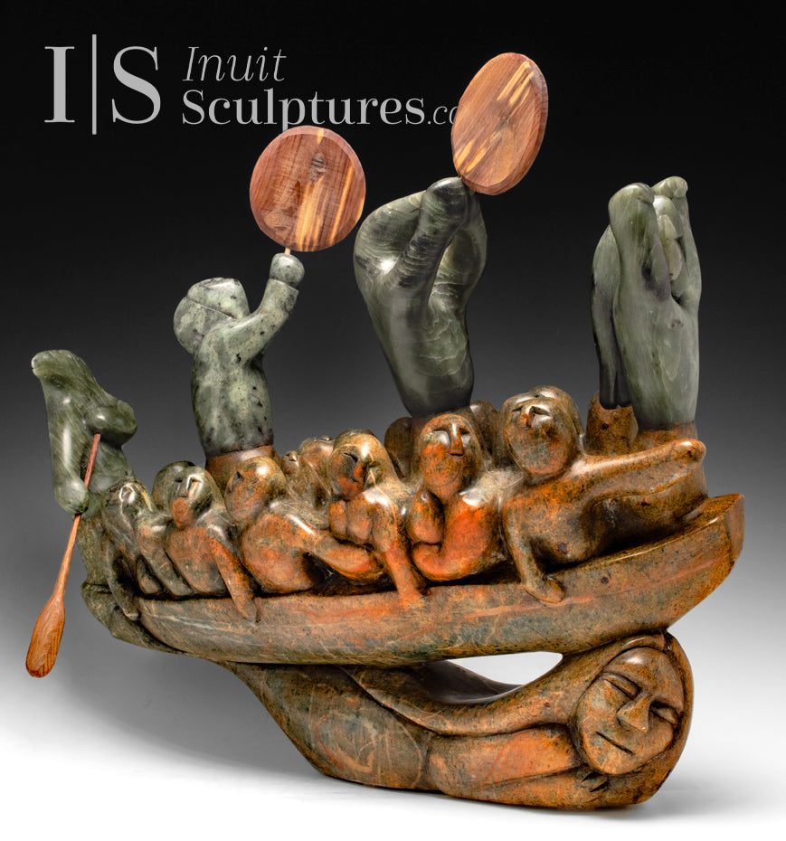 The carver documents the voyage of Inuit men in their Umiak.(boat)