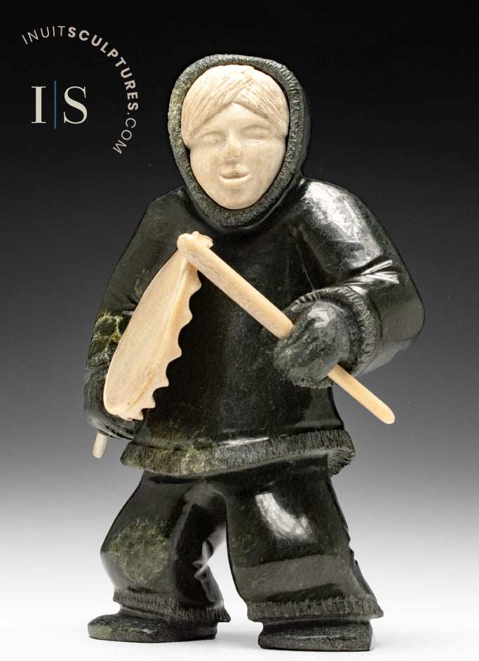It would be so simple for the artist to present the piece with a more primitive face but instead, Dale has taken the extra time to carve a face that describes the emotions the Inuk is feeling as he bangs his drum.