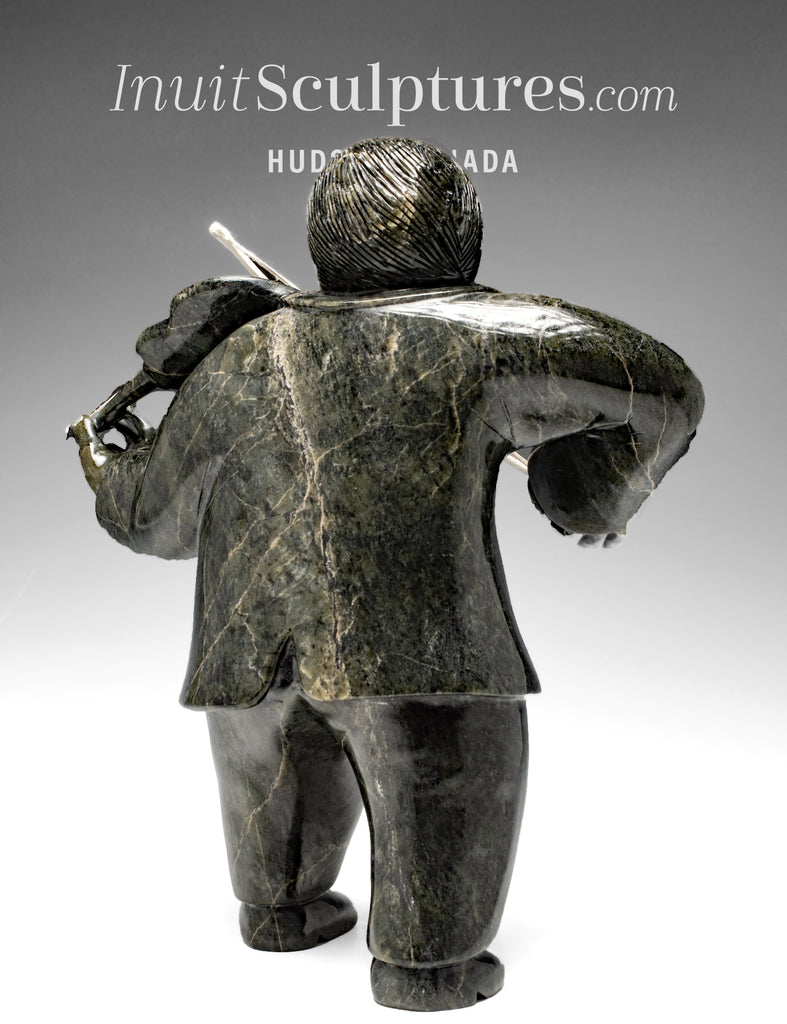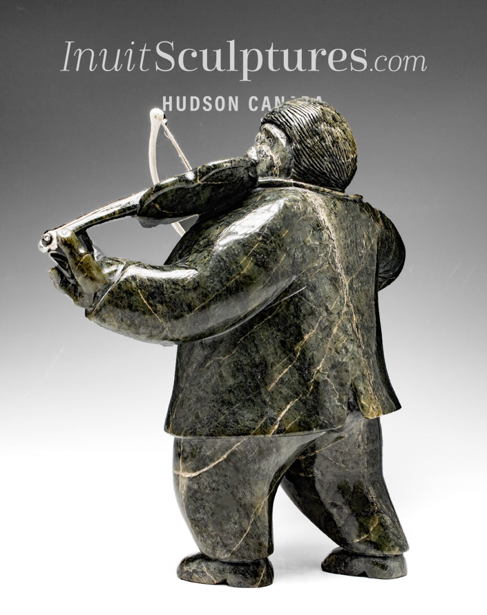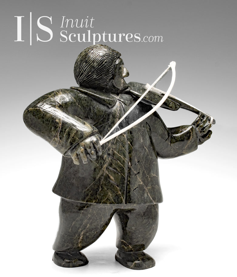 This Inuit fiddler has so much personality. He is large and square and proudly holds his fiddle high. His upper body is much larger than his legs giving him a bit of a cartoonish appearance. But this Inuk is a serious musician.