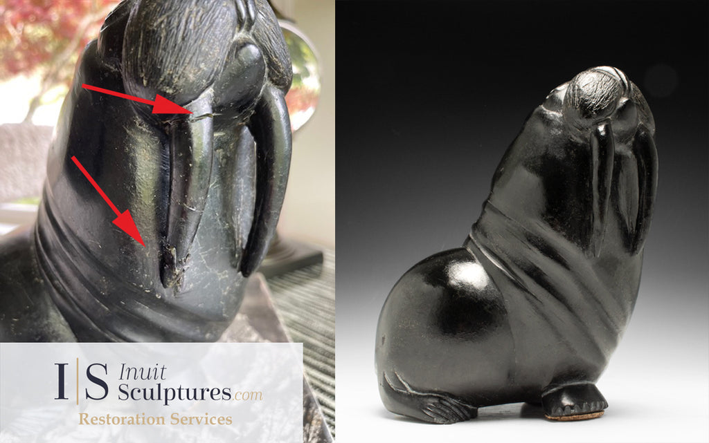 Here is a beautiful Eskimo sculpture by the late Noah Eachalook. It fell off the table and had multiple fractures.