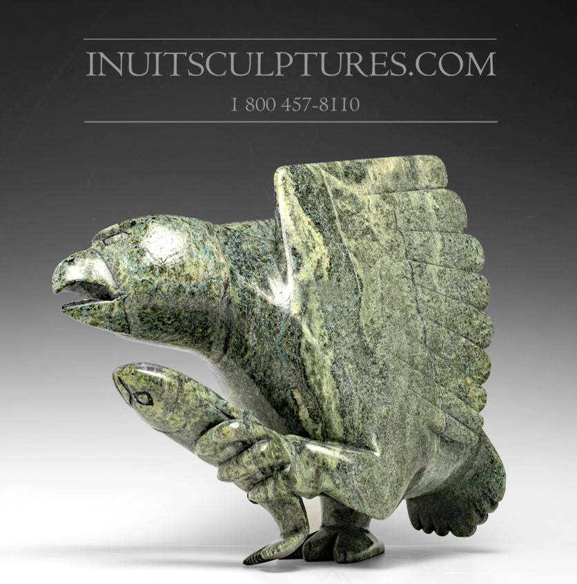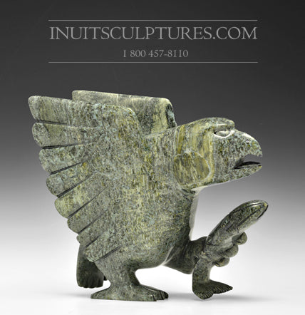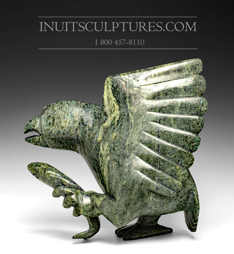 This Hawk is perfect.ly carved from the forest green stone to the incredible wings. Killiktee has carved the wings in a fanned position which emphasizes each wing feather.