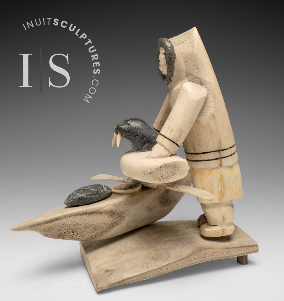 NEW MUKLUKS FOR MAMA is a beautifully carved and designed depiction of an Inuk Hunter with his Kayak and his catch.