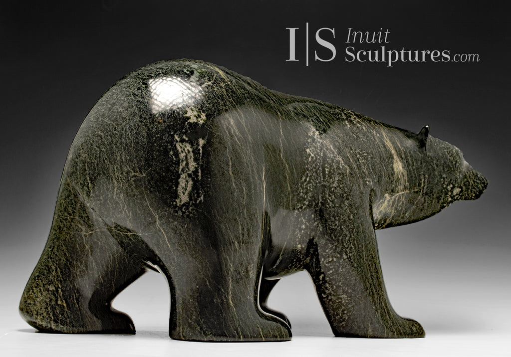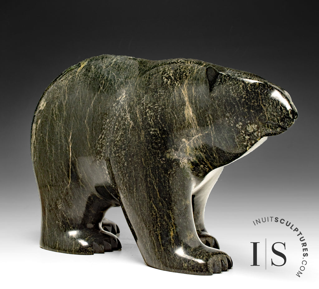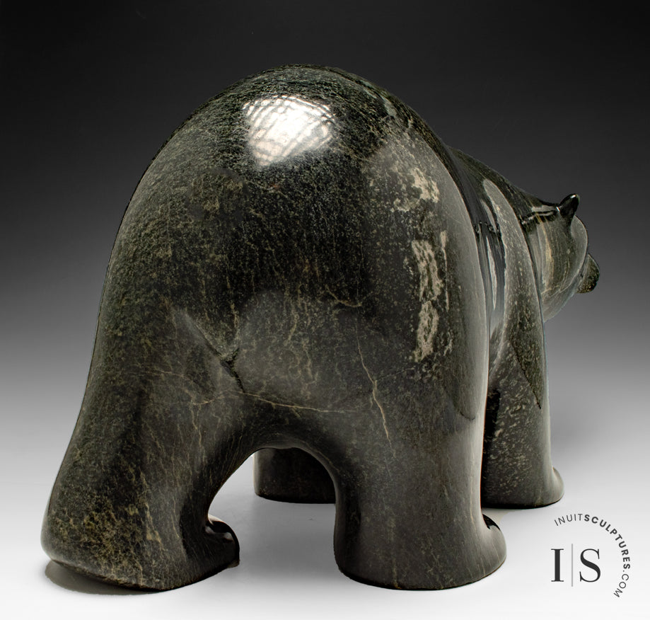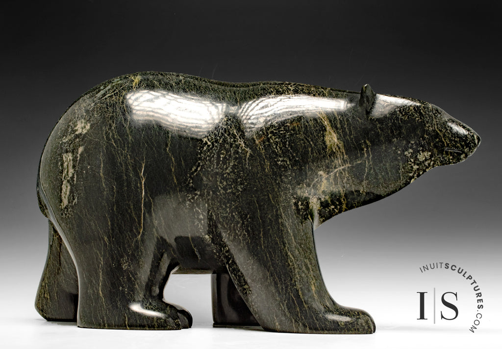 Ashevak Adla's *Stalone*, is one of the nicest Walking bears that you will ever see. The deep dark green serpentine stone freckled with gold and adorned with thin veins is extremely rare in my opinion.