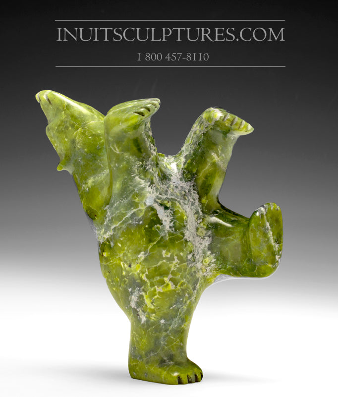 This bear was obviously carved by an artist who carefully observed the animal subjects and Loved them. Despite being carved from a large sized, heavy stone, the work has a lightness of spirit. The apple green stone is divine and electric.