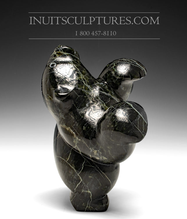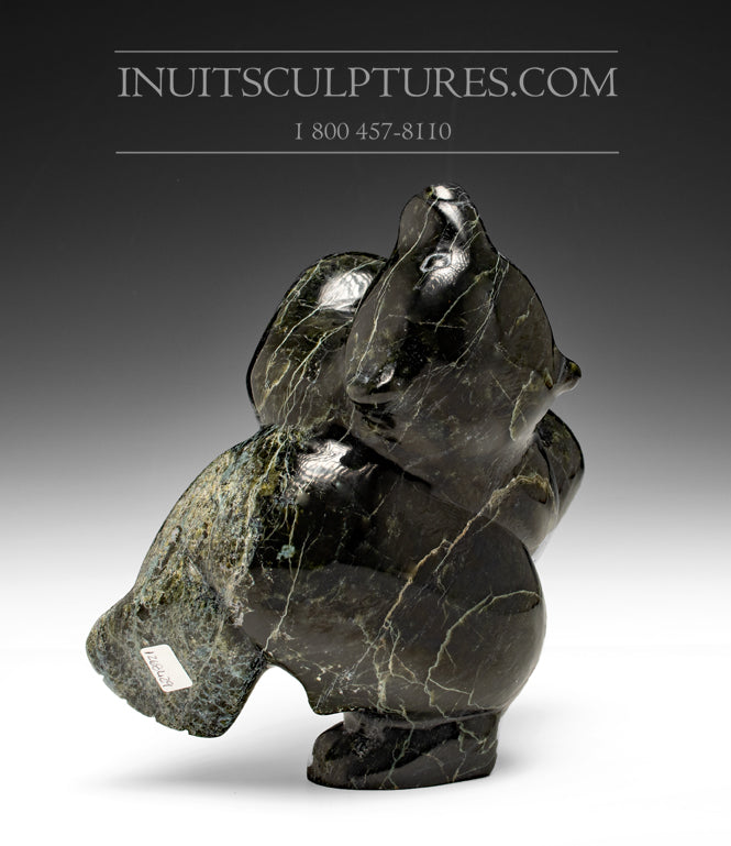 Markosie Papigatook’s Dancing Bears are adored simultaneously for their playfulness and their athletic prowess.  Some of the bears appear to be practising martial arts which would make them a perfect gift for the yellow, green or black belt practitioner in your life. These bears’ dual nature reflects the influence the modern world has had on Inuit art.