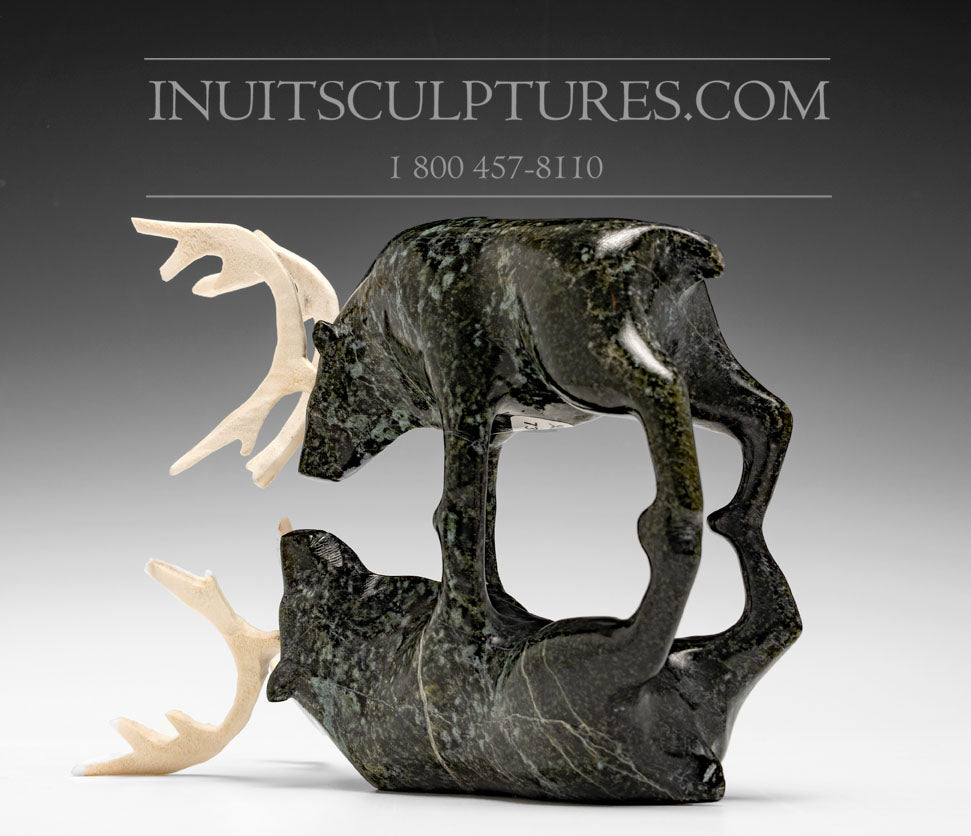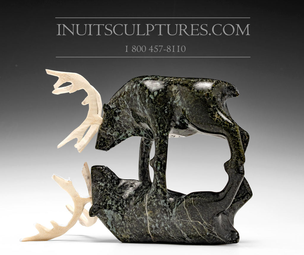 This is a beautiful traditional serpentine scenting caribou with his reflection by Tony Oqutaq. The colouring is electric, which is why we liked it. This caribou has a wonderful pose as it is sniffing. The movement is gorgeous and was made by a very reputable inuit artist.