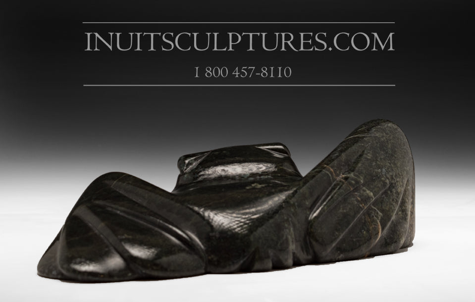 The eyes made from caribou antler blend exquisitely with the dark serpentine stone. The carving is polished to a mirror shine with beautiful proportions and lines throughout.