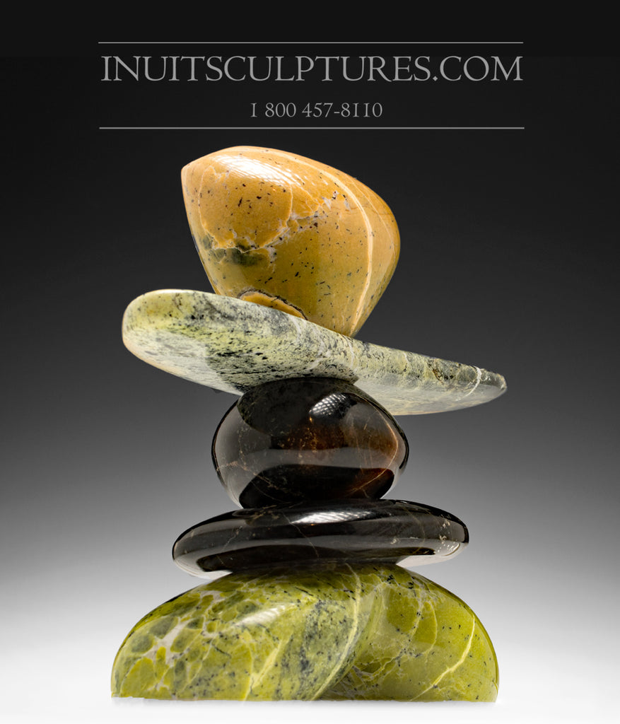 This is a gorgeously balanced inukshuk done in a striking serpentine stone. It has multiple colorations in the stone. The animation of Paul's Inukshuks are what really makes them stand out from all other Inukshuks.