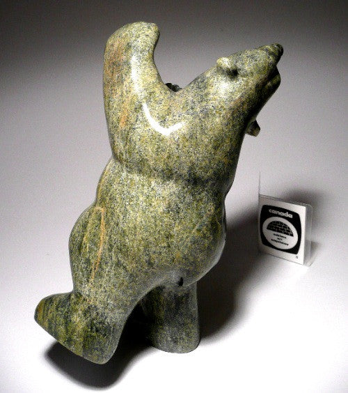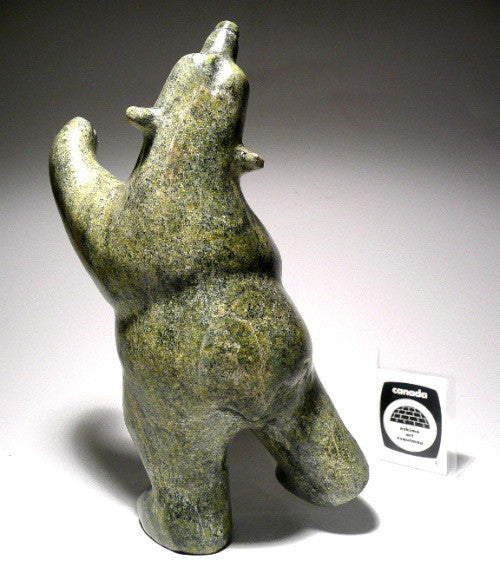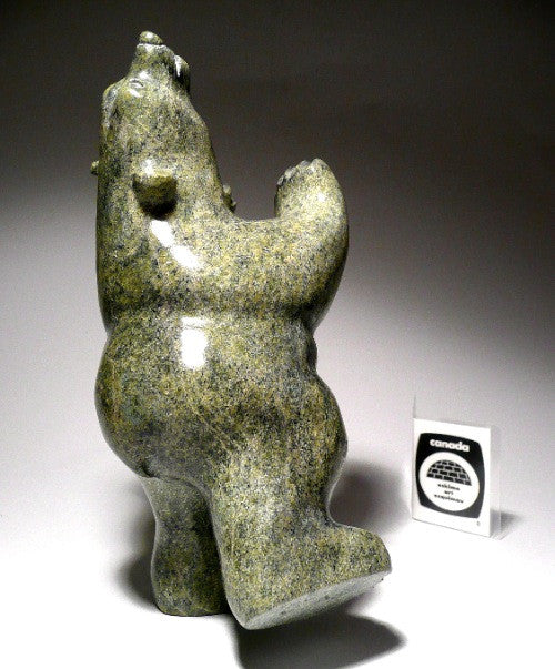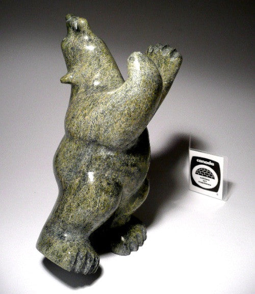 This is a superb and striking traditional green dancing polar bear by master Inuit carver Johnny Manning from Cape Dorset