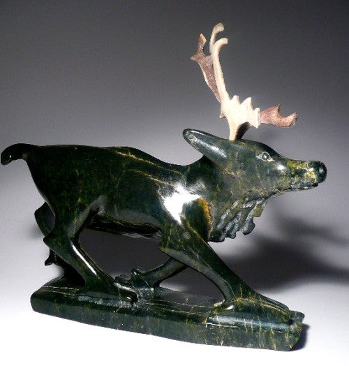 Pavinak is well known internationally for his caribous. This is his signature carving. I always liked caribou carvings because they are nice animals in general. The beautiful bone antlers contrast nicely with the dark green stone. It is a very positive subject and sends happy vibes to its surroundings.