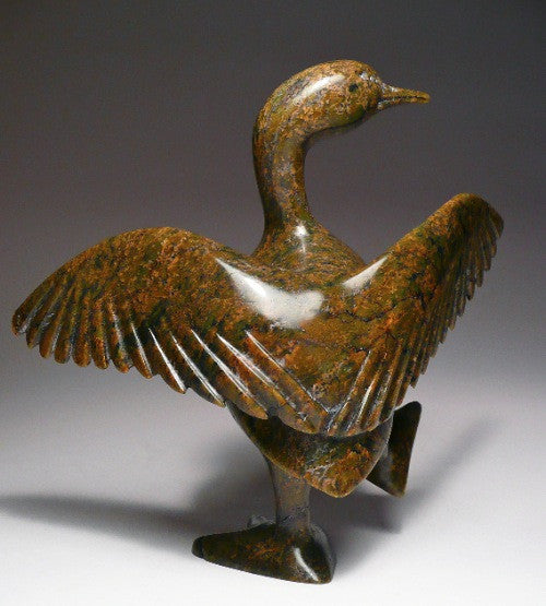 Pudlalik Shaa makes beautiful masterpiece birds. His dancing gooses are his signature theme. The proportions to his pieces are always perfect and well balanced. What I especially admire about his pieces are the stylized curvatures and colors he uses. The heads of his birds are very beautiful.