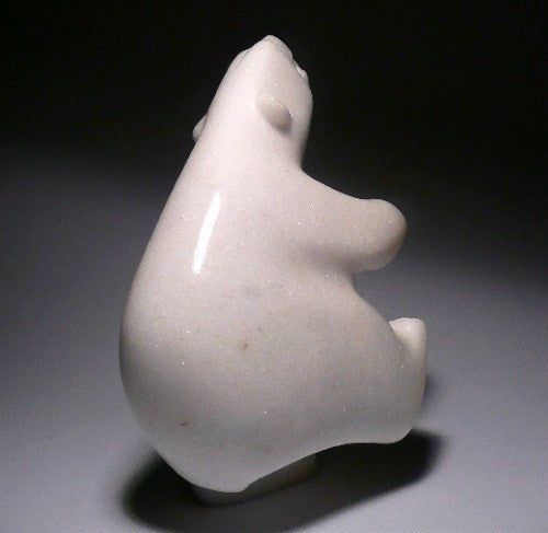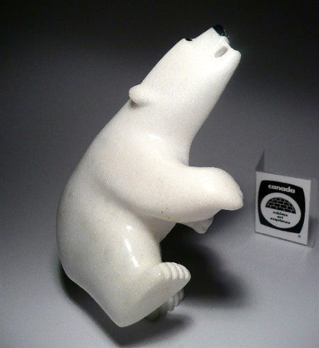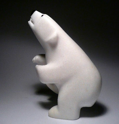 This is a striking white marble dancing bear by Sapa Ashoona. It is dancing on one foot and has nice proportions. Sapa Ashoona often carves dancing bears. It is his specialty. What I particularly like about this dancing bear is that it is white. I like white carvings because they really radiate the room are very noticeable.